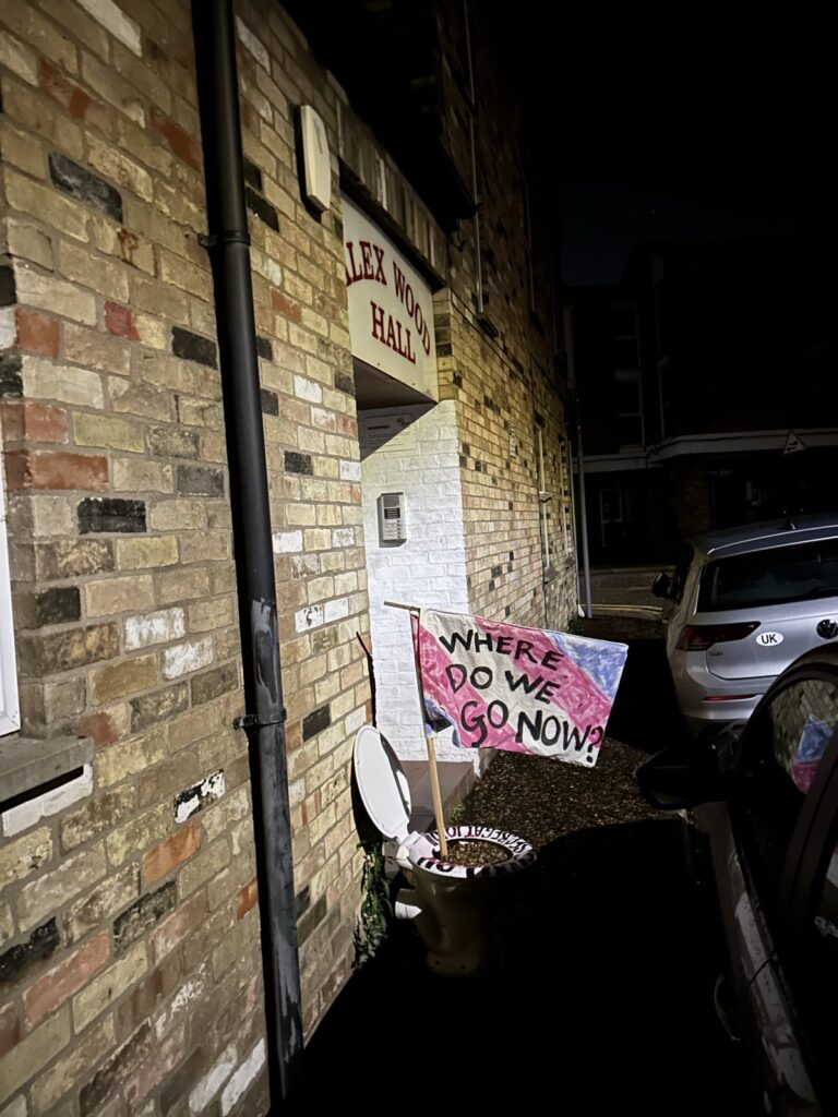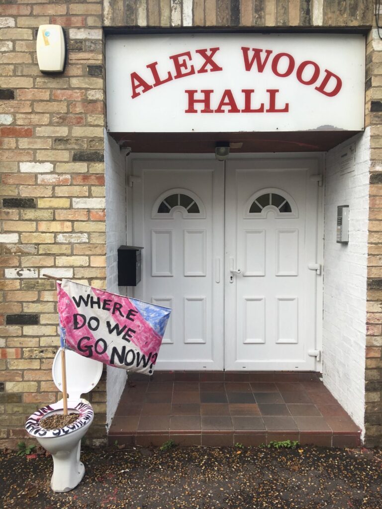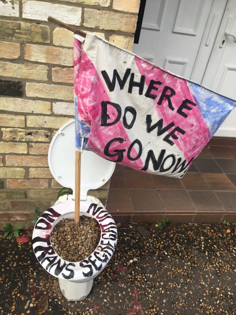 In the early hours of yesterday morning, activists left an entire toilet in front of the Cambridge Labour Party offices on Norfolk Terrace, whose seat read “no trans segregation” and in which was planted a flag reading “where do we go now?”